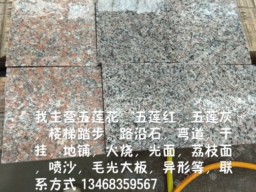 山東省青山石業(yè)有限公司主要經(jīng)營 、五蓮紅 、五蓮花 、五蓮灰 、芝麻灰、蘑菇石、 馬蹄石 、路邊石 、磨光路沿石 、火燒板 、光板 、樓梯踏步 、圓球 、擋車柱 、羅馬柱 、花壇石、 各種異型石等 ,真誠期待您的來電與合作。 廠址 :山東省五蓮縣石材產(chǎn)業(yè)園 微信電話:13468359567* 17563353123* 0633-3929188