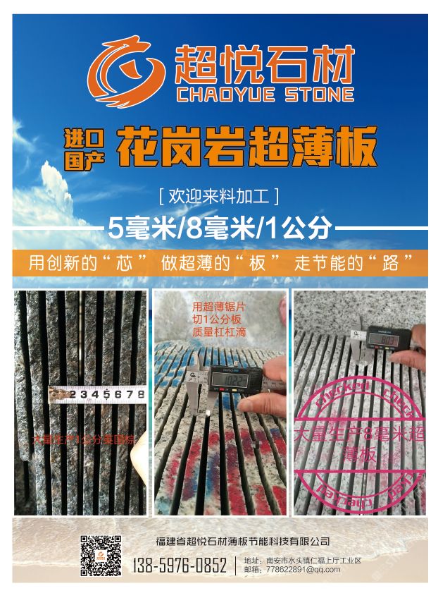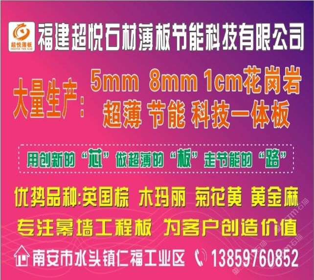 是一家專注于生產、研發(fā)1CM超薄板/2.5CM干掛板的花崗巖研發(fā)型企業(yè)。秉承“用創(chuàng)新的芯、做超薄的板、走節(jié)能的路”的發(fā)展理念,深受國內知名地產公司和幕墻裝飾公司的青睞和認可,已與多家知名地產幕墻裝飾公司簽約長期戰(zhàn)略合作。\\