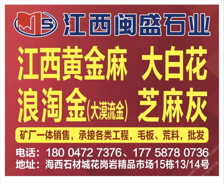 鑫山石業(yè)常年出售浪淘金(幻彩金麻),金絲麻,臺(tái)灣青,南非綠荒料,可根據(jù)客戶要求加工各種規(guī)格的薄板,延長板,荔枝板,自然板,厚板,中長板,工程板,光板,毛板,路沿石,樓梯踏步,色帶,廣場磚及自然面,荔枝面,噴砂面,火燒板等異型石材用于,高檔建筑室內(nèi)外墻面磚,地鋪石,路沿石,機(jī)拋石等,研發(fā)部門嚴(yán)把質(zhì)量關(guān),保證發(fā)貨期限,企業(yè)宗旨:“同等質(zhì)量比價(jià)格,同等價(jià)格比質(zhì)量”我廠尋求長期合作伙伴,與您攜手共創(chuàng)財(cái)富明天!浪淘金,是河北的一種優(yōu)質(zhì)黃色花崗巖,無色差,光潔度高,是裝飾內(nèi)墻、外墻、吧臺(tái)的理想產(chǎn)品,大量出口歐洲,日韓,中東等地.歡迎新老客戶來電訂購,量大價(jià)格優(yōu)惠。咨詢熱線: