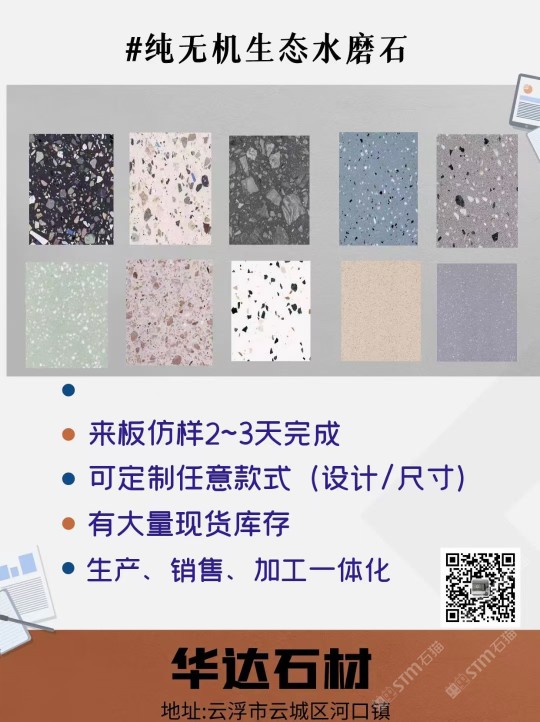 云浮市華達聚賢新型石材有限公司是一家以研發(fā)制造、加工、銷售新型人造石、天然石及其制品的企業(yè)。公司位于云浮市云安區(qū)石城鎮(zhèn)上洞村,占地面積30000平方米,年可生產(chǎn)人造無機石板材、自流平仿石材產(chǎn)品120萬平方。公司擁有原材料生產(chǎn)配套基地,保證日常生產(chǎn)所需的石料、石粉,有成品加工生產(chǎn)車間,有直營門店銷售,能為客戶提供從原材料選料、打樣定制、生產(chǎn)加工、工程配套等服務。華達聚賢新型石材無機水磨石、仿石材產(chǎn)品,屬于循環(huán)利用環(huán)保產(chǎn)品,所有原材料都是無機類選材,產(chǎn)品美觀實用,耐污耐磨,防火性能好,無異味,色彩斑斕,搭配元素多樣,深受國內(nèi)外設計師喜愛,適用于家具、商場、學校、酒店、地鐵站、政府機關、企業(yè)機構(gòu)等大型公共設施室內(nèi)外鑲貼,屬新型環(huán)保建材。公司通過GB/T19001-2016idtISO9001:2015質(zhì)量管理體系認證和GB/T24001-2016idtISO14001:2015環(huán)境管理體系認證。