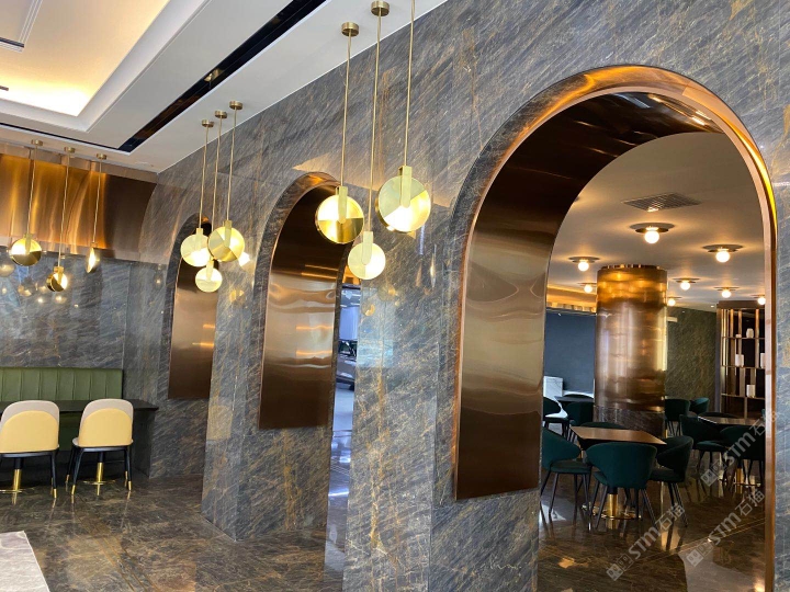 發(fā)布信息: 長(zhǎng)春富邑四季匯會(huì)館 ”琥珀灰與金色金屬的兼容性極高,從門(mén)口金字招牌,到金色門(mén)框,到用于隔斷的金色架子,再到裝飾用的懸吊的金色飾物,大理石加金屬,金色配合深色,碰撞到一起進(jìn)一步營(yíng)造高端奢華感?!?/span>