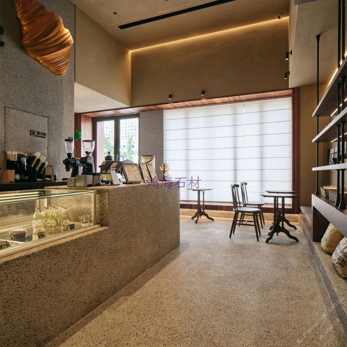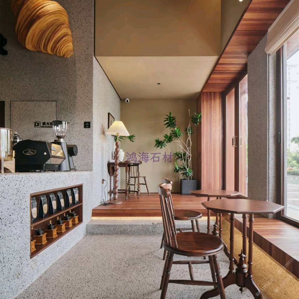 發(fā)布信息: 咖啡店設計干貨|水磨石 木格柵的組合 一進門就被水磨石打造的吧臺狠狠洗衣,顆粒感的肌理搭配溫潤的木質(zhì)吊柜,觸感和視覺的碰撞真的太妙了~ 墻面的“與你相識雖不晚”直接戳中內(nèi)心,旁邊的巨型可頌裝置既是裝飾又點明了品類,細節(jié)感拉滿。 動線設計也很舒服,點單區(qū)和取餐區(qū)劃分清晰,哪怕人多也不會覺得擁擠,把功能性和美學平衡得恰到好處。