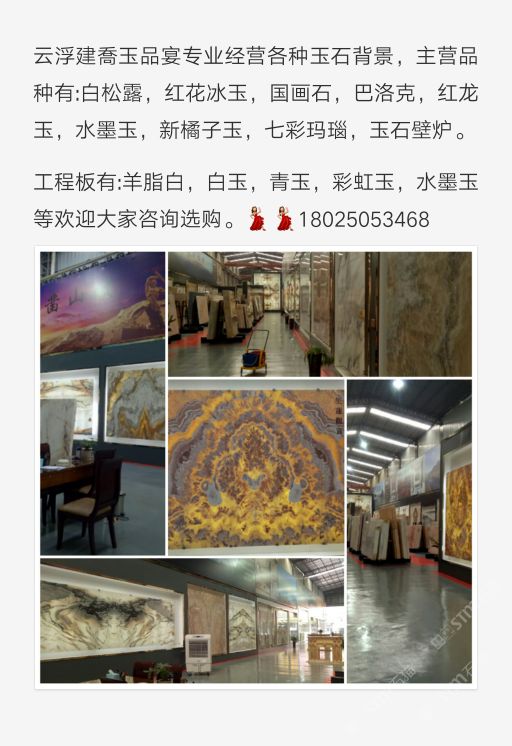云浮建喬玉品宴 聯(lián)系人:劉小姐    180****9248 查看 手機(jī)號(hào)碼:無(wú) 主營(yíng)范圍: 石材工藝品、大板批發(fā)、 企業(yè)地址:廣東云浮云浮市324國(guó)道加德士加油站往廣州方向500米
