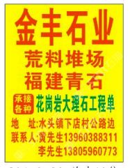 發(fā)布信息: 《金豐石業(yè)》 水頭的福建青石出售花崗巖荒料 自有礦山 主營:雕刻 欄桿 光面 荔枝面 燒面 磨菇面 自然面 小方塊 路沿石 承接:各種花崗巖大理石工程單 地址:水頭鎮(zhèn)下店村公路邊 聯(lián)系人黃先生13960388311